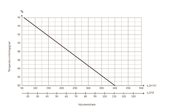 TemperaturvirkningsgradTemperaturvirkningsgrad for standardaggregat med modstrømsveksler. Testet i henhold til EN13141-7, tør virkningsgrad. NB! Temperaturvirkningsgraden er for modstrømsveksleren alene (uden varmepumpedrift) |