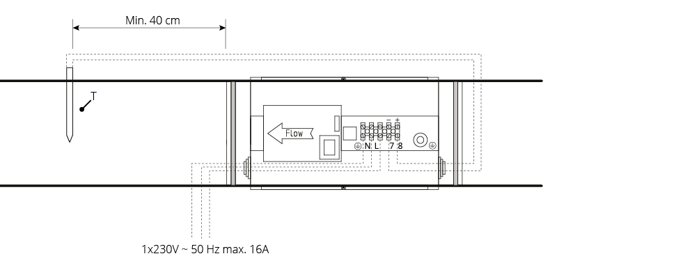 Det er vigtigt, at temperaturføleren placeres mindst 40 cm fra forvarmefladen, for at opnå en ordentlig regulering. OBS! Varmefladen skal isoleres med et brandhæmmende isoleringsmateriale, dog må tilslutningsboksens låg ikke isoleres