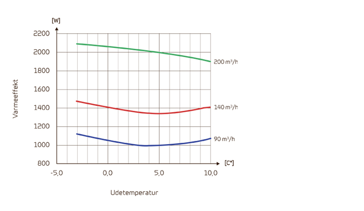 Varmeeffekt indblæsningVarmeeffekt Qc [W] som funktion af volumenstrøm qv [m3/h] og udelufttemperatur [ºC] fraluft = 21 ºC, i henhold til EN14511. Varmeeffekt er det bidrag til rumopvarmningen som friskluften tilføres gennem VP 18 M2 til indblæsningsluften. Ventilationstabet er den varmeeffekt, der tabes uden varmegenvinding ved den givne volumenstrømsluft. |