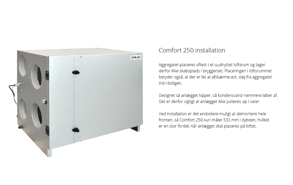 Aggregatet placeres oftest i et uudnyttet loftsrum og tager derfor ikke skabsplads i bryggerset. Placeringen i loftsrummet betyder også, at der er let at afskærme evt. støj fra aggregatet ind i boligen. Ved installation er det desuden muligt at demontere hele fronten, så Comfort 250 kun måler 532 mm i dybden, hvilket er en stor fordel, når anlægget skal placeres på loftet. Comfort 250L er venstre version og Comfort 250R er højre version.