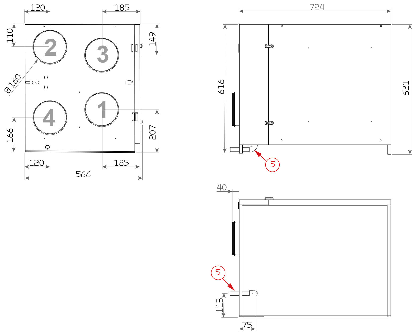 Målskitse af Comfort 250L Polar venstre version (tilluft venstre side)