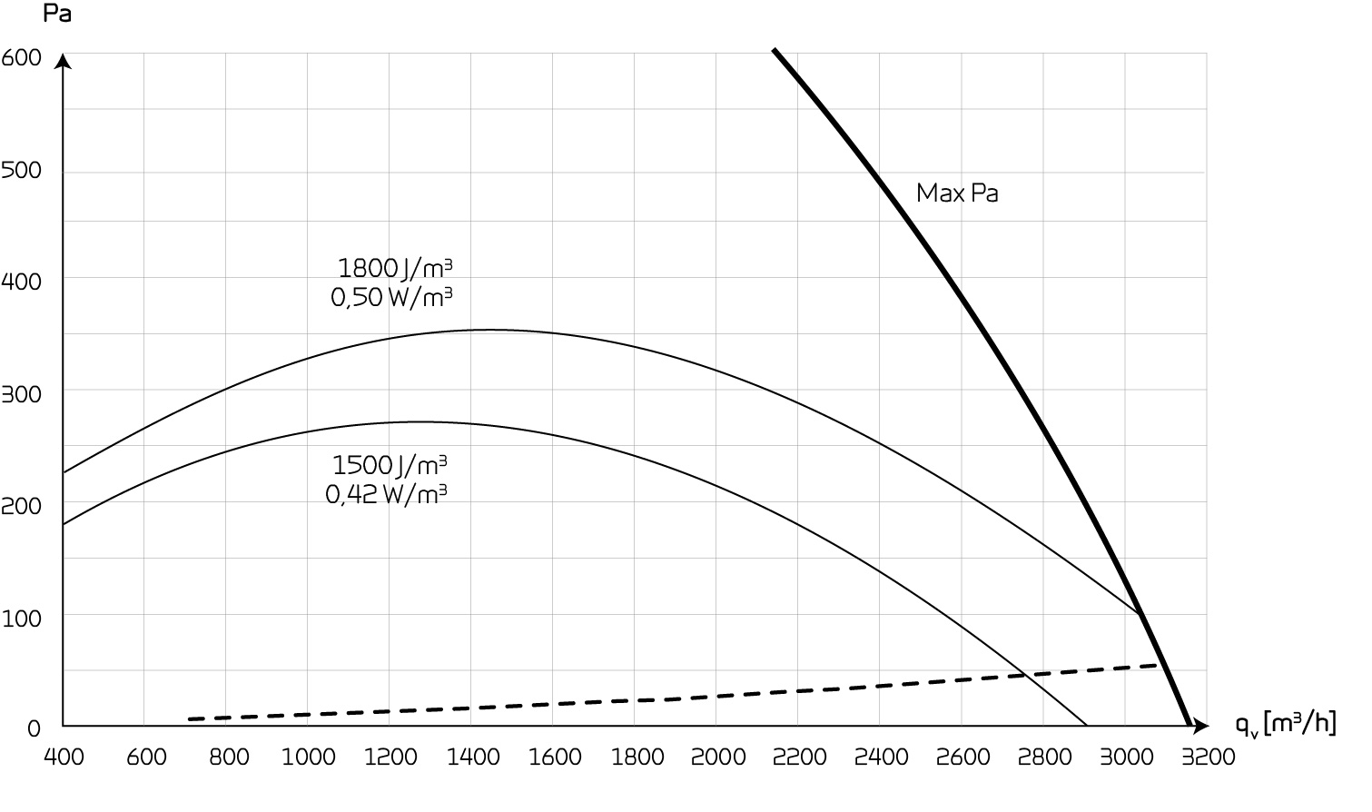 Kapacitet (kondensationsveksler)Projekteringsdata er beregnet på baggrund af en kondensationsveksler. Max Pa kapacitet af standardaggregat, Pt ext som funktion af qv under hensyntagen til SFP-værdierne. SFP-værdier iht. EN 13053 er for standardaggregat med ISO ePM10 >60% (M5) og ISO ePM1 50% (F7) filtre og uden varmeflade. OBS! SFP-værdierne er målt og angivet som en samlet værdi for begge ventilatorer. |