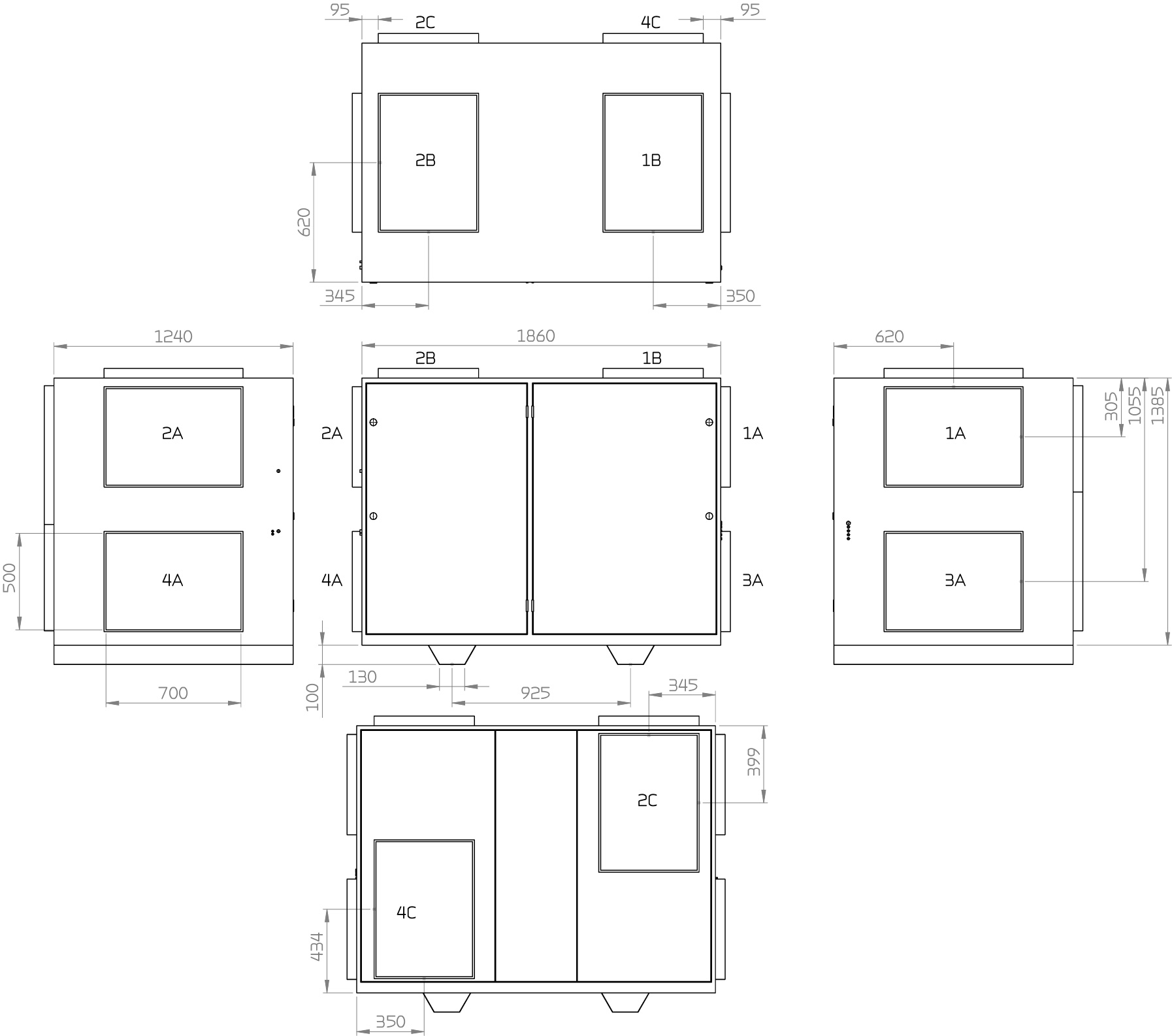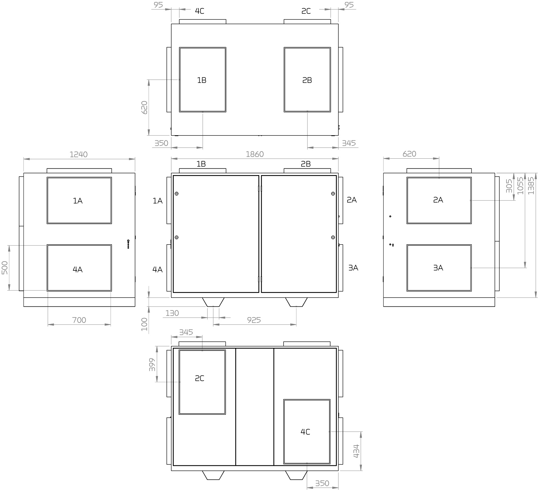 Alle mål er vist i mm. 1. Udeluft A. Gavl placering |
