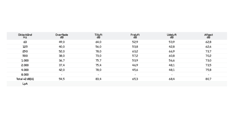 LyddataLyddata er for qv = 5600 m3/h og Pt ext = 200 Pa i henhold til EN 9614-2 for overflade og EN 5136 for kanaler. |
