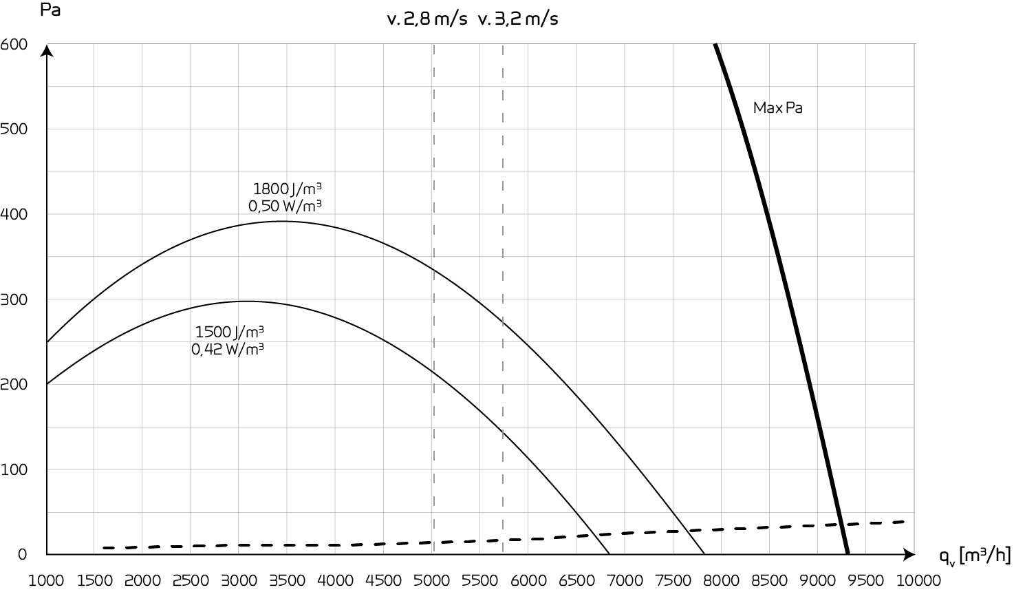 KapacitetProjekteringsdata er beregnet på baggrund af en kondensationsveksler. Max Pa kapacitet af standardaggregat, Pt ext som funktion af qv under hensyntagen til SFP-værdierne. SFP-værdier iht. EN 13053 er for standardaggregat med ISO ePM10 >60% (M5) og ISO ePM1 50% (F7) filtre og uden varmeflade. * Lufthastighed over fordamperfladen er målt ved meter pr. sekund. OBS! SFP-værdierne er målt og angivet som en samlet værdi for begge ventilatorer. |