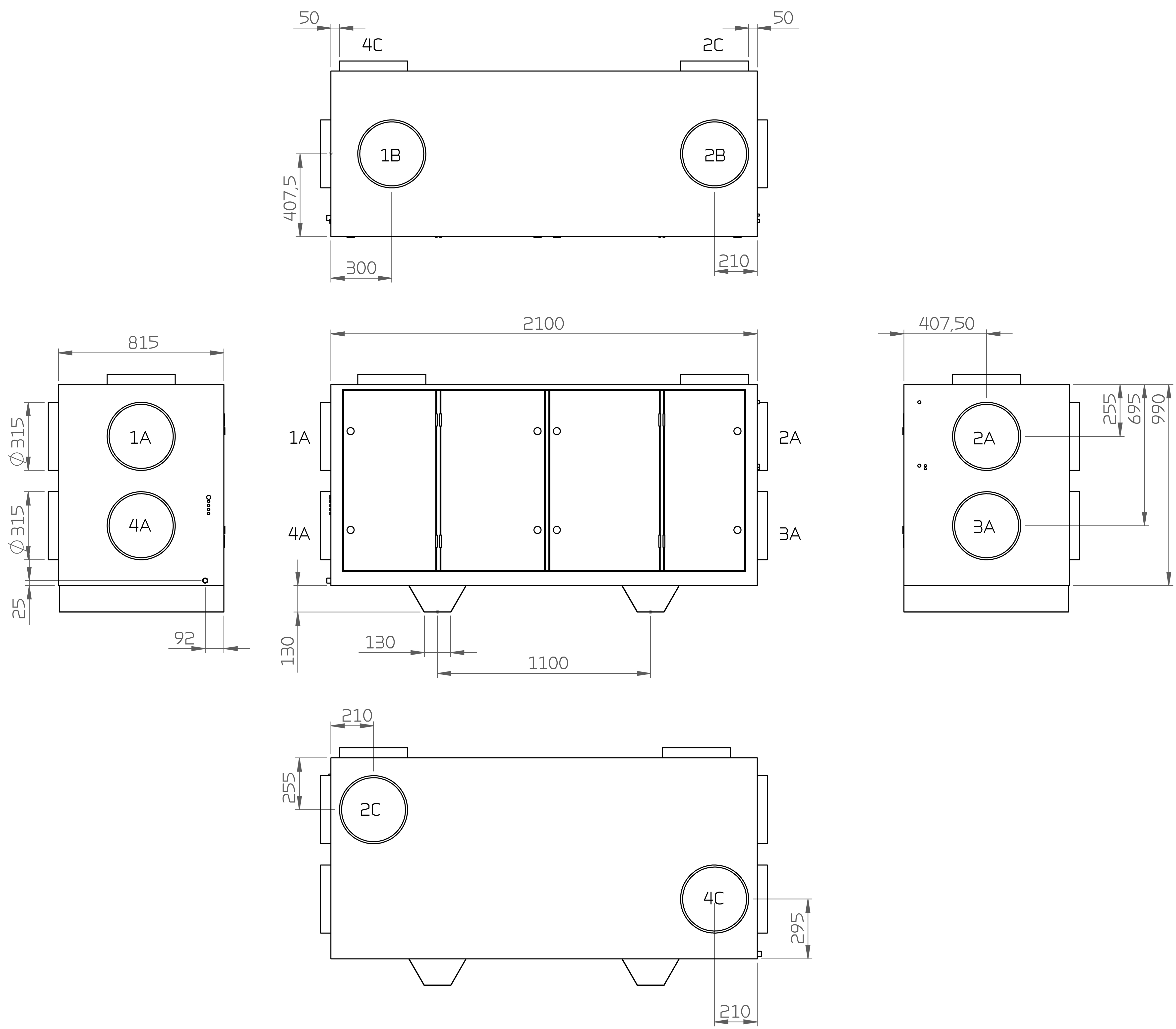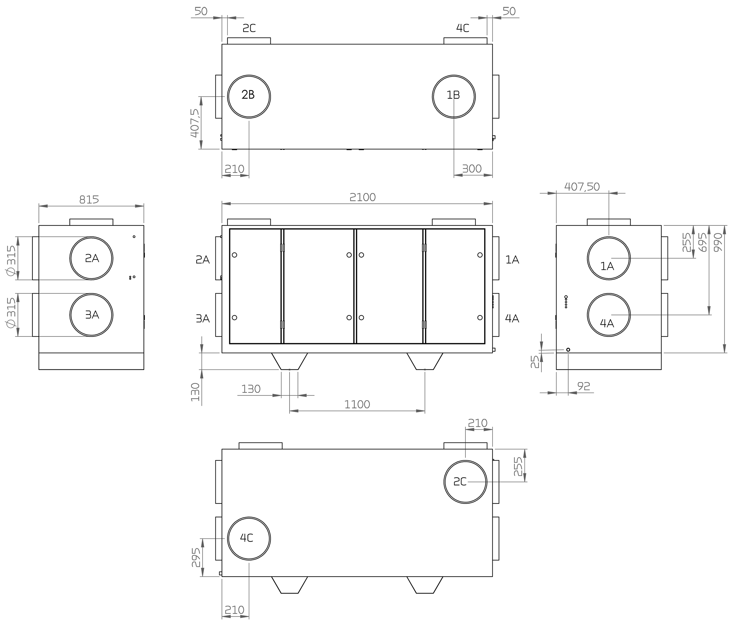 Alle mål er vist i mm. 1. Udeluft A. Gavl placering Målskitse for VPR 120 (højre):